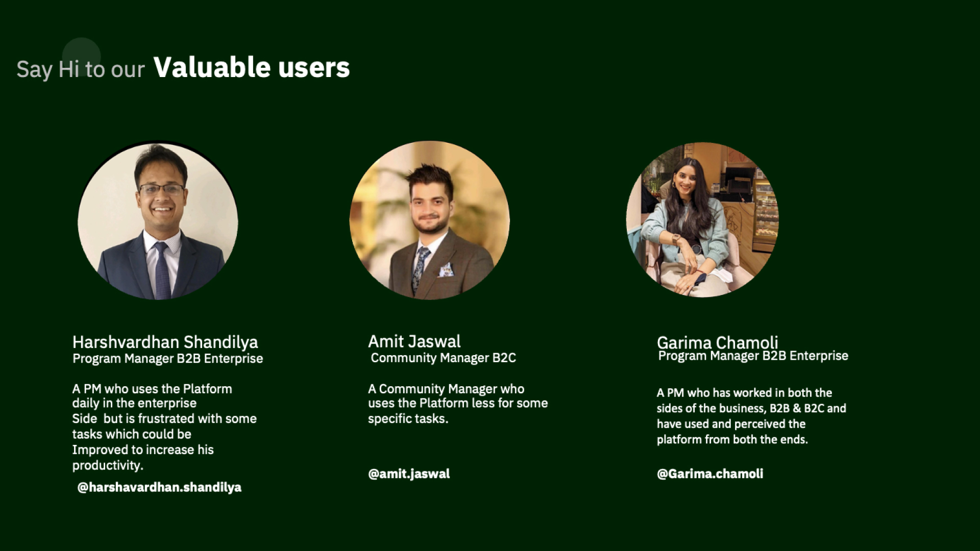 During our research and discovery phase, I engaged with approximately 20 Program Managers, along with 5 Business Unit (BU) heads and Senior Program Managers. Additionally, we distributed a questionnaire to the larger team to gather quantitative insights.